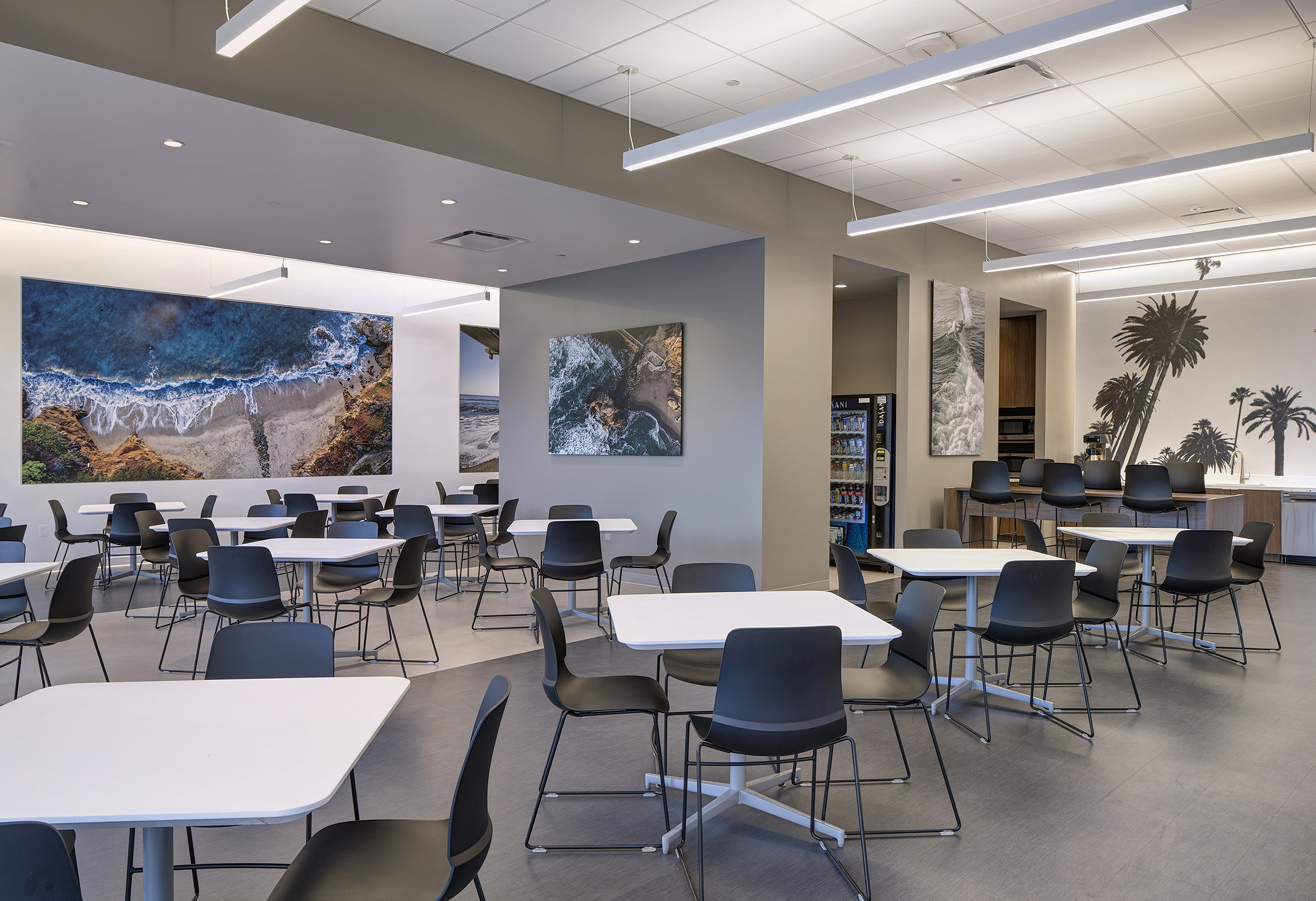 - Associated support spaces: private offices, shared office space, employee amenities, restrooms, a breakroom, and IT storage