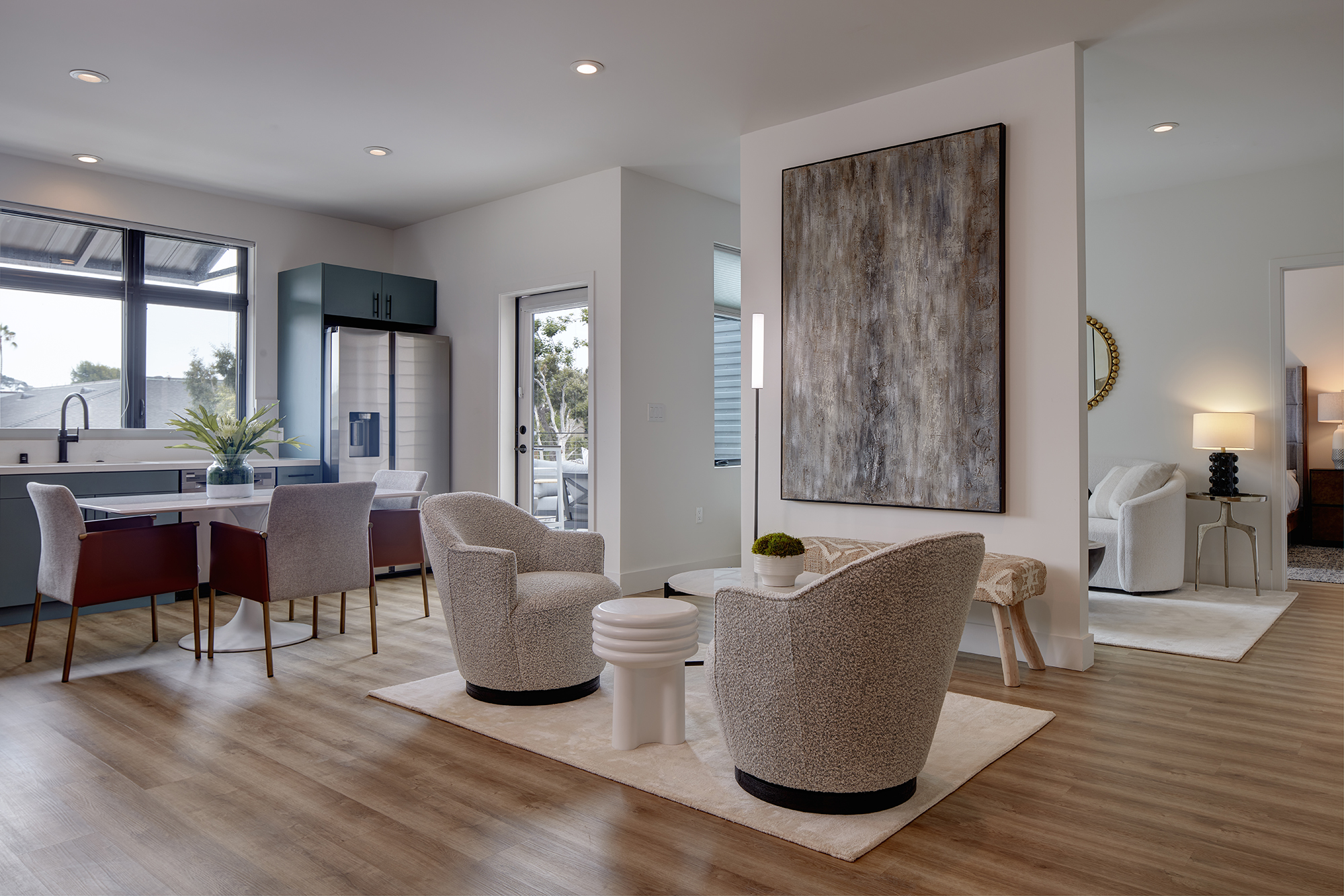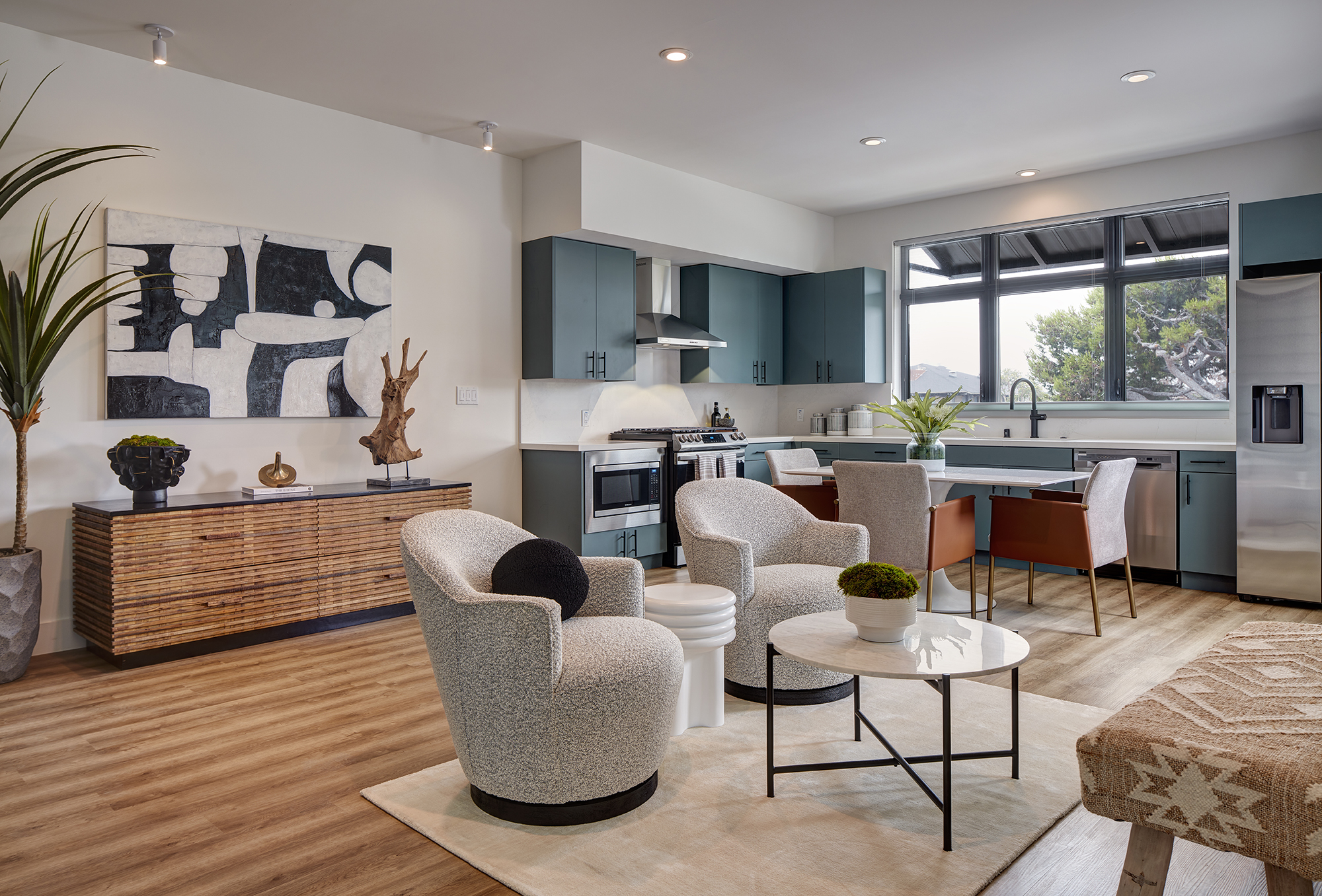 - Quartz countertops, stainless steel appliances, soft-close cabinets, walk-in closets, and private patios